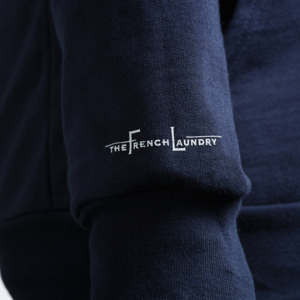 The French Laundry sweatshirt is made in the USA from 100% certified organic cotton fleece for a soft, comfortable feel. The relaxed silhouette offers ease without being overly loose, complemented by a classic hood with drawstring, a full pouch pocket and a subtle clothespin—The French Laundry’s logo.